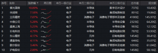 细分方向来看,半导体龙头领涨,紫光国微一字涨停,华润微涨超7%;消费电子龙头方面,立讯精密涨超7%,歌尔股份涨逾3%;PCB(印制电路板)龙头方面,东山精密涨超4%,沪电股份、生益科技涨逾2%。