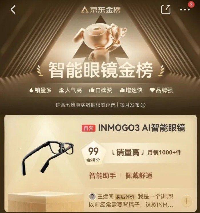 其中INMO GO3凭借销量、人气、口碑、品牌、增速五大核心维度的综合优势,强势霸榜京东智能眼镜金榜第一。