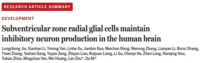 据介绍,清华大学米达团队联合中国医学科学院北京协和医院朱兰院士团队,系统鉴定出人类大脑中一种全新的神经干细胞类型,其能在胚胎期持续产生抑制性神经元,供应大脑发育所需。