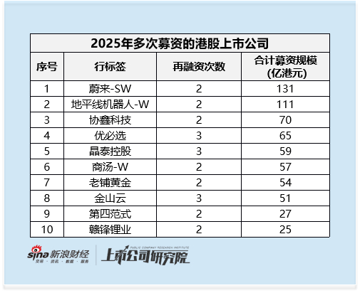 灵活的规则催生了“按需融资、持续补充”的市场格局。2025年,共有63家公司完成了2次及以上的再融资,通过多次募资为业务扩张、技术研发注入资本动力。其中,蔚来2次融资合计募集131亿港元,地平线机器人2次融资累计111亿港元,优必选更是实现3次融资合计65亿港元。然而,也有部分市场观点认为,港股再融资市场由于依托一般性授权即可完成发行、无需额外监管审批的规则设计,可能出现无序融资的现象。