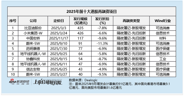 而再融资市场的募资格局则截然不同,其更能反映港股二级市场的行业偏好:可选消费行业以989亿港元的募资规模占据36%的份额,成为绝对主力,这一规模由多笔标志性大额项目支撑:比亚迪435亿港元的增发规模登顶港股最大融资,蔚来汽车两笔增发合计募集131亿港元。信息技术行业以668亿港元募资紧随其后,其中,小米完成426亿港元增发、地平线机器人通过两笔增发融资110亿港元。医疗保健行业合计募资447亿港元,占比16%,行业内的大型再融资项目包括药明康德77亿港元融资、信达生物43亿港元融资,体现出市场对优质医疗企业的资金倾斜。