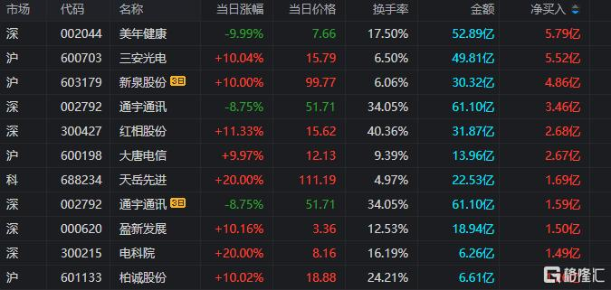 龙虎榜单日净买入额前三为美年健康、三安光电、通宇通讯,分别为5.79亿元、5.52亿元、3.46亿元。