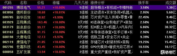 焦点股方面,智能电网板块博菲电气9天6板,股权转让的新华百货3连板,溢价主动退市的德邦股份3连板,资产重组的五矿发展3连板。