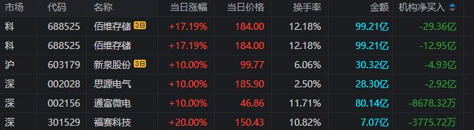 佰维存储:上涨17.19%,换手率12.18%,成交量56.91万手,成交额99.21亿元。龙虎榜数据显示,机构合计净卖出12.95亿元,北向资金合计净买入2.15亿元。