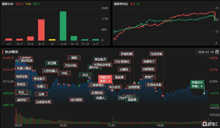 1月16日,A股震荡下行,全市场成交额3.06万亿元,较前一交易日增量1180亿元。