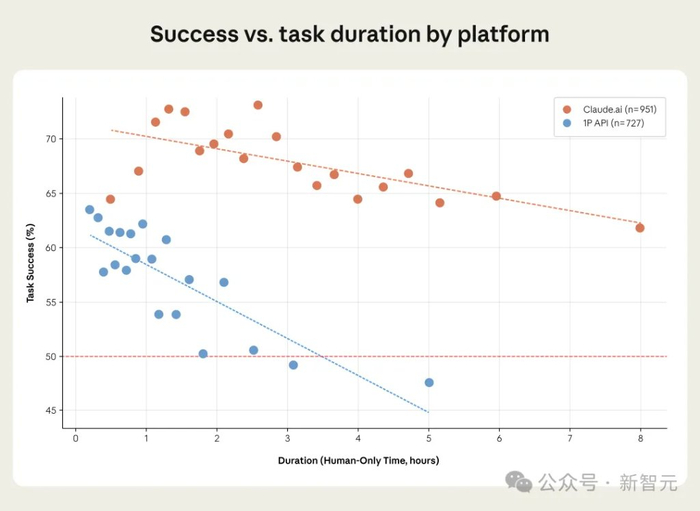 但在 Anthropic 的实际用户数据中,这个时间界限被显著拉长了。