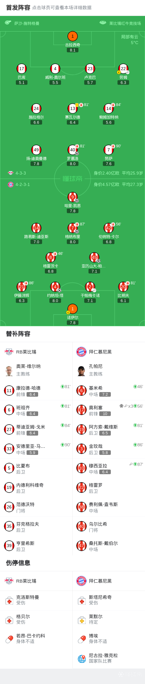 拜仁5-1莱比锡,奥利塞3传1射,穆西亚拉伤愈送助攻