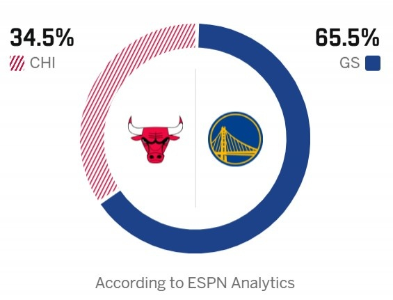 ESPN预测本场比赛胜率,勇士65.5%,公牛34.5%。